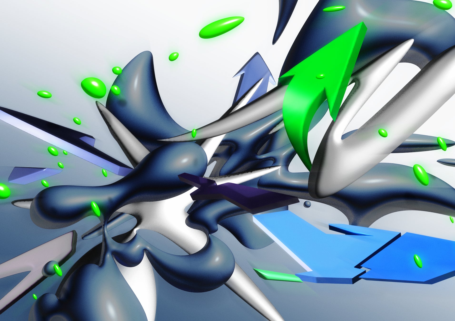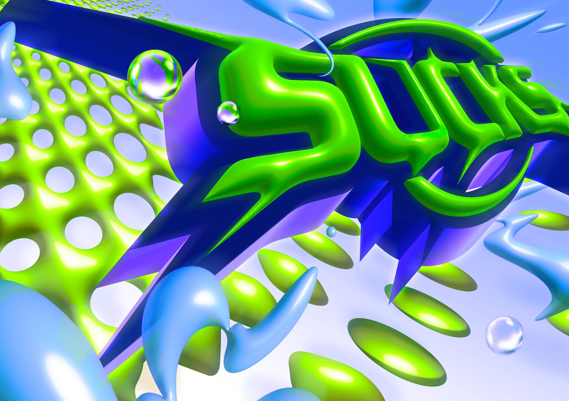 鋭さと硬質さを感じる立体的なフォルムのタイポグラフィ、鮮やかでありながら毒々しさが漂う配色といった、独自のスタイルでグラフィック作品を制作。