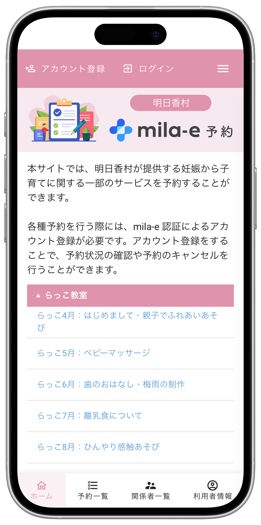 母子健康手帳アプリ「mila-e おやこ手帳」と組み合わせて、面談・相談、教室・イベント予約などを中心にご利用いただいております。