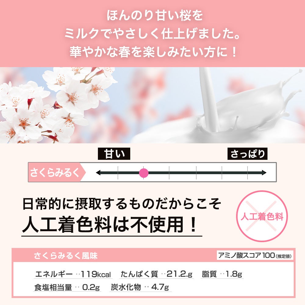 桜餅の葉のような塩味は控えめに、絶妙な甘さとほっこりしたミルクの甘さに仕上げました。プロテインでありながらも華やかな桜の風味で春の訪れを感じていただけます。