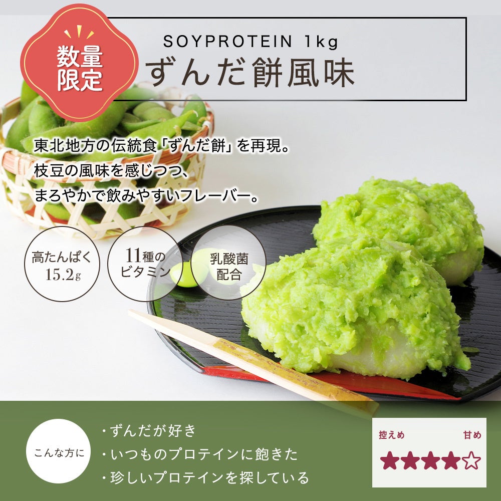 フレーバーです。ずんだが好きな人やいつものプロテインに飽きた人、珍しいプロテインを探してる人におすすめ!