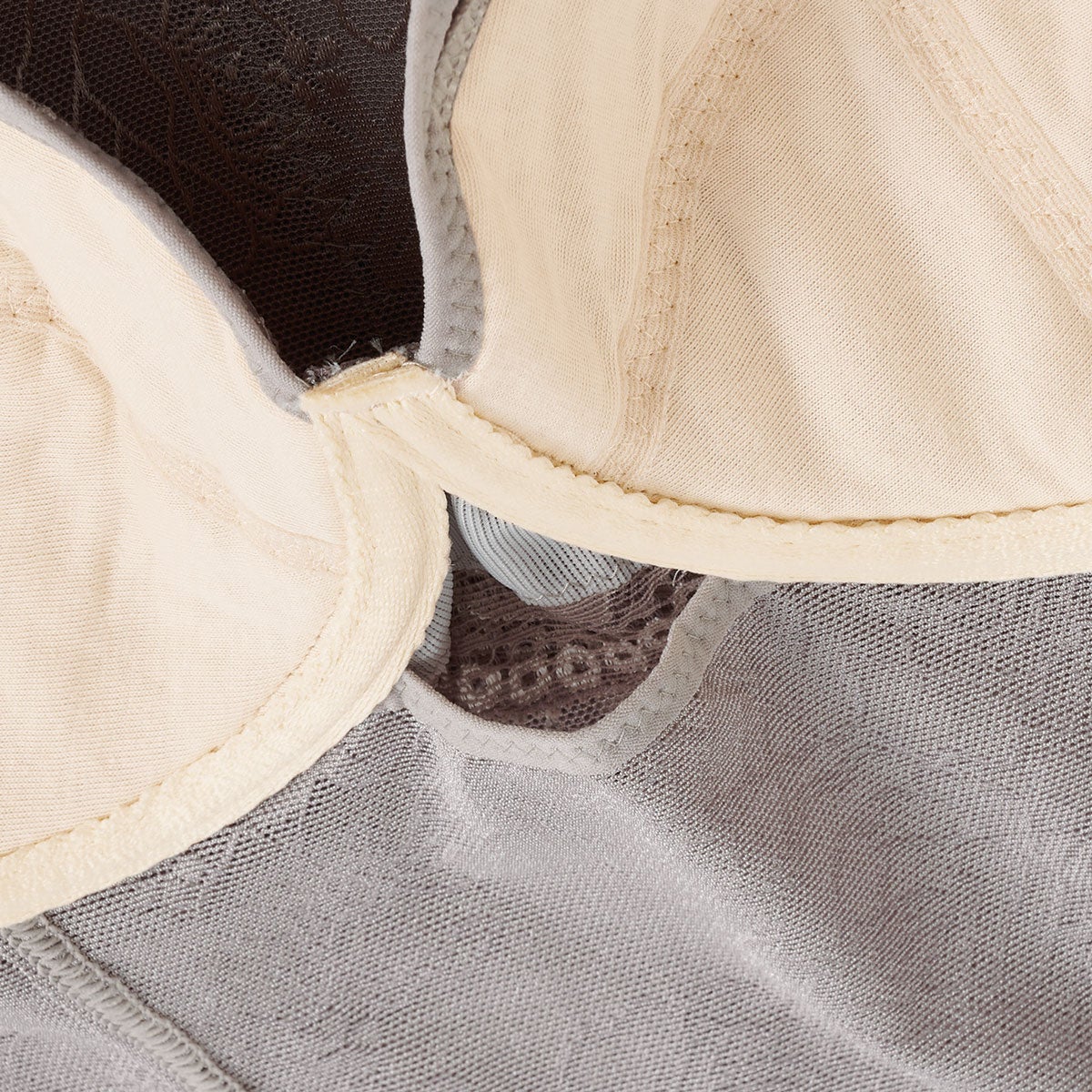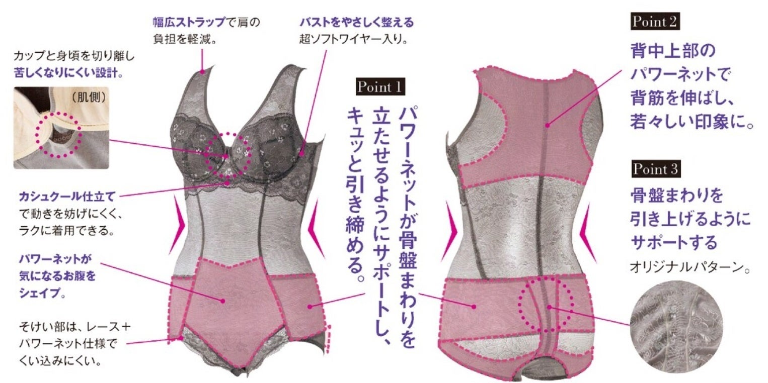線画調のバラ柄パワーネットを採用し、軽やかでエレガントに、身に着けることで心も華やぐように仕上がっています。カップとボディ部分を切り離すことで、ボディスーツ特有の引っ張られる感じを軽減。着用することで自然に姿勢をサポートし、骨盤まわりを引き締める設計に。また、気になる部分にのみパワーネットを裏打ちして、無理なく着用出来るように様な仕様になっています。