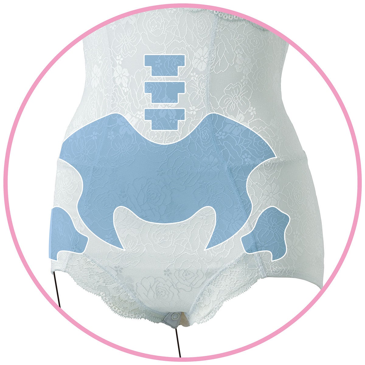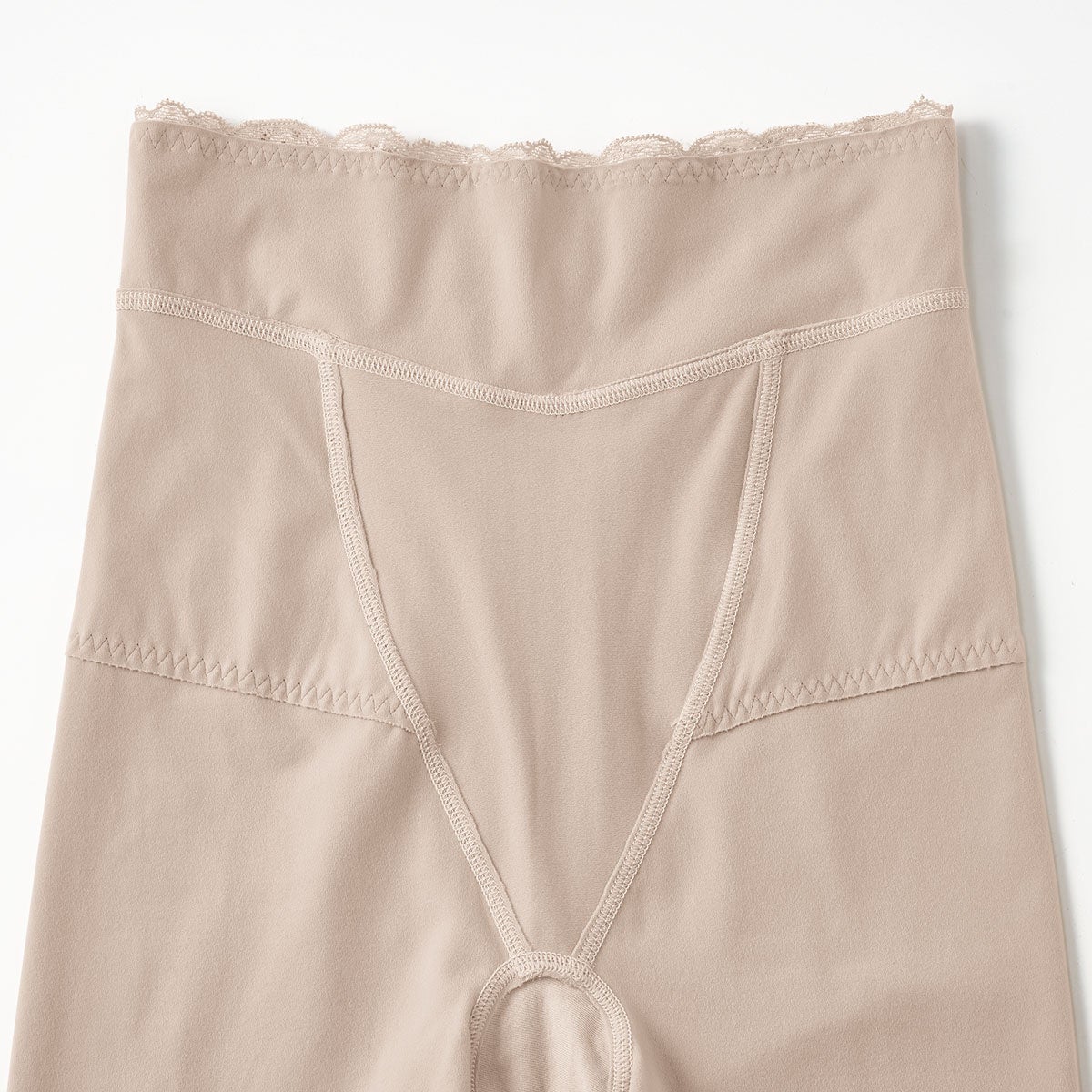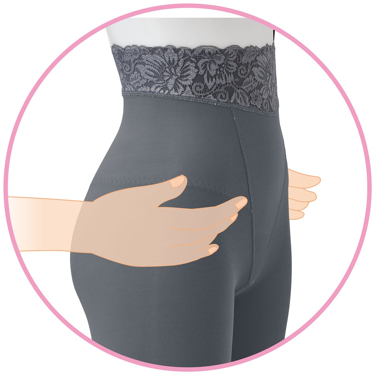 着心地にこだわり、肌当たりが良く暖かい微起毛素材を採用しています。ウエストと足口は身生地にレースを重ねた仕様に。また、裏当てには共生地を使用し、さらに気になるお腹には二重にした生地の間にパワーネットを挟み三重仕立てになっています。快適なのに程よいサポート機能を付け、毎日着用出来るガードルに仕上がっています。