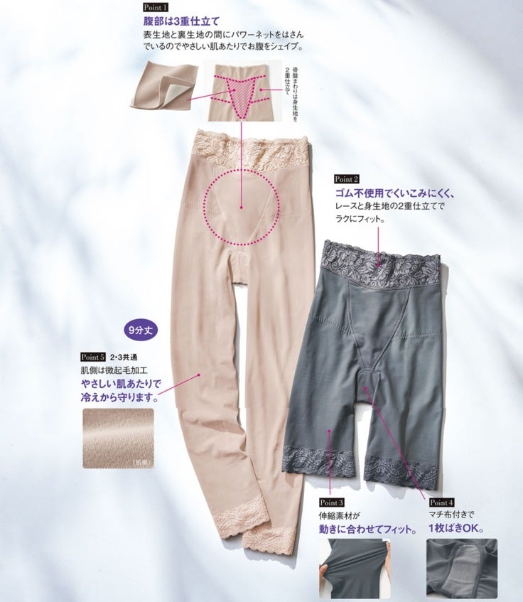 『なめらか微起毛ハイウエストガードル』は肌触りの良い肌側微起毛素材で、あたたかさと補整を同時に叶える仕様になっています。9分丈、5分丈の2丈をご用意しておりますので、アウターに合わせて着用いただけます。