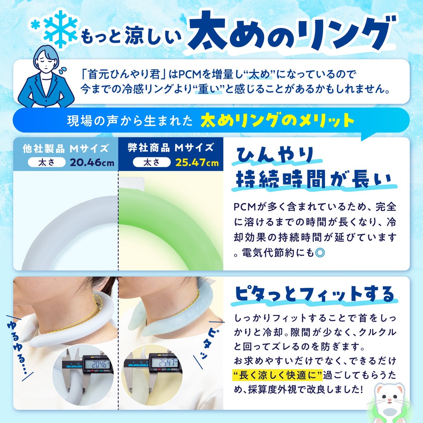 『首元ひんやり君』では、従来品と比べてPCMが30%増量されている”太め”のクールリングです。