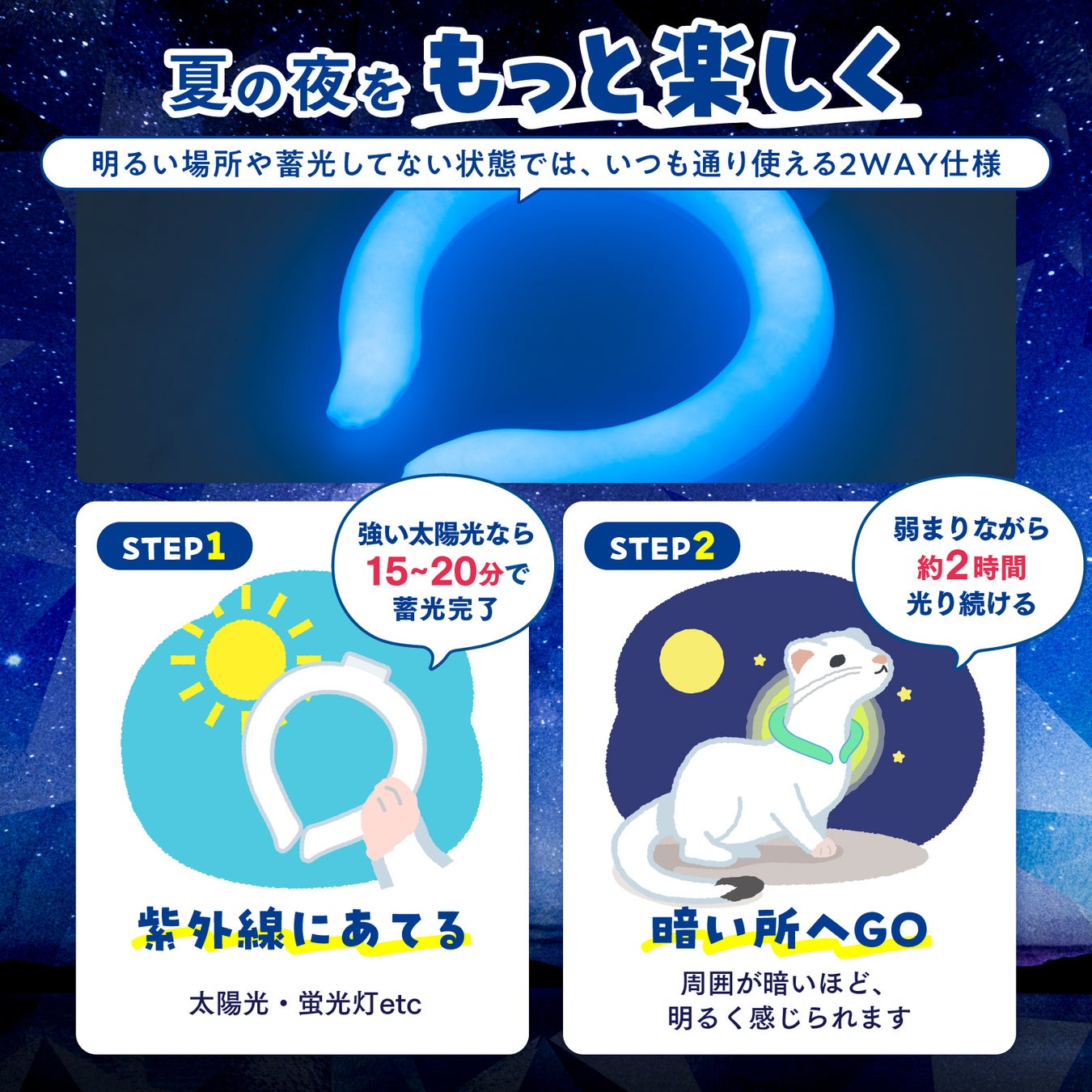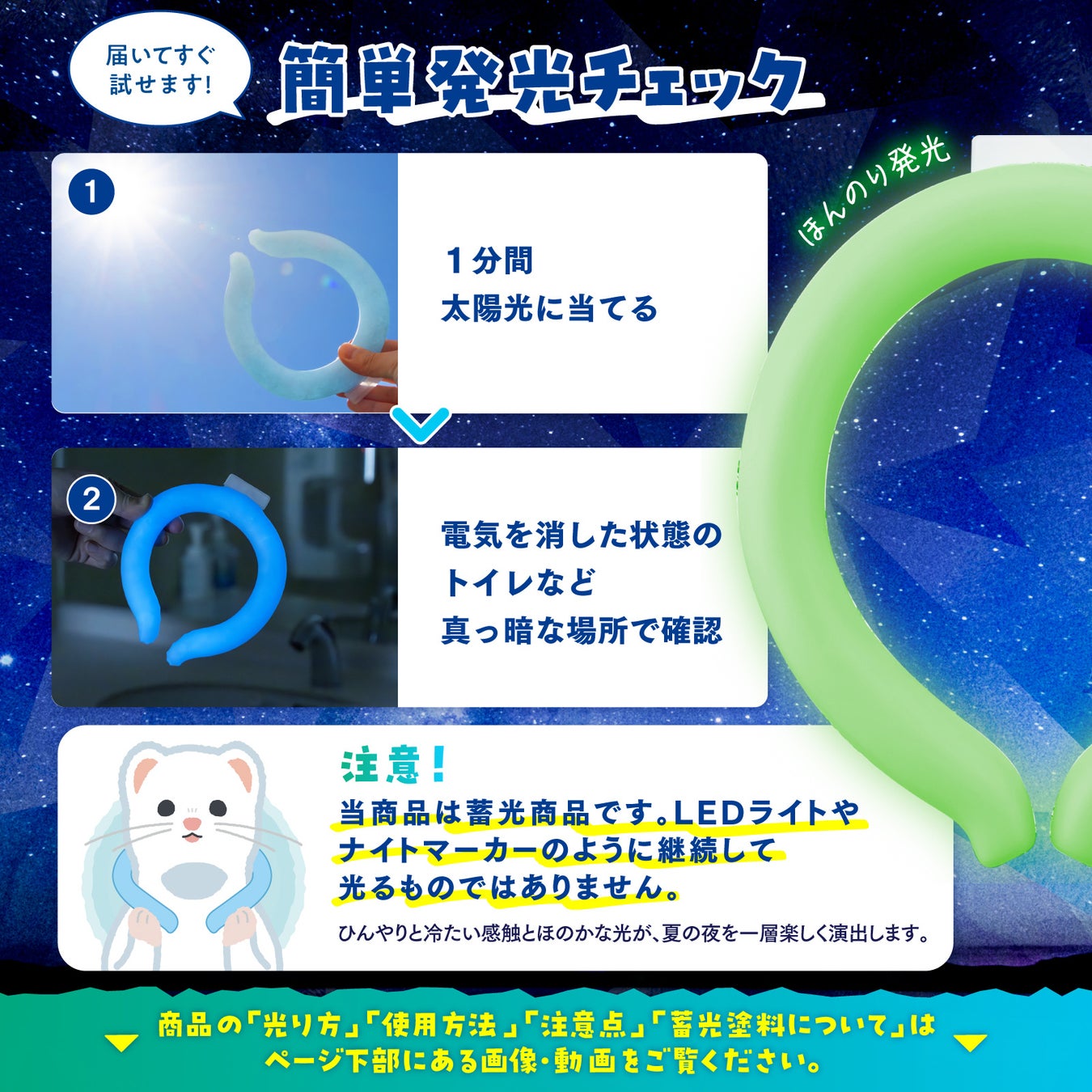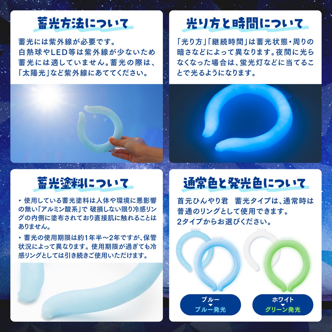 『首元ひんやり君 ほんのり蓄光タイプ』は、暗闇で鮮やかに光るクールリングです。