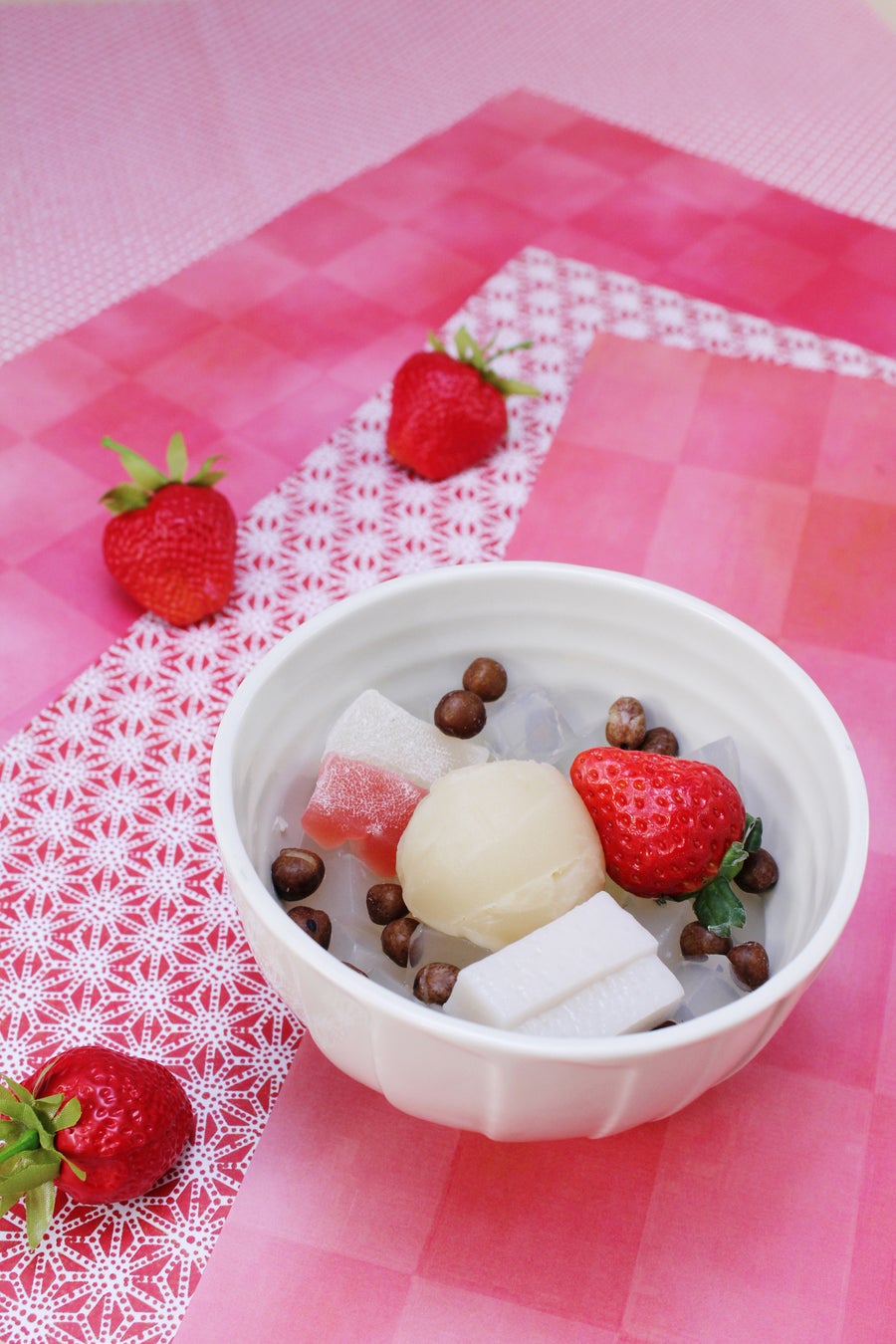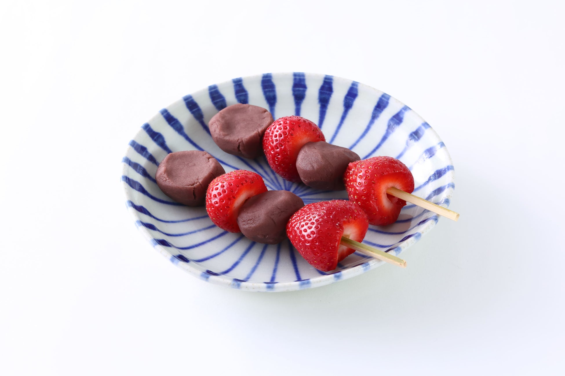 昨年好評だったいちご団子(ミニ)を、食べ応えのある4粒刺しでご用意しました。あんこと甘酸っぱいとちおとめが口の中で混ざりあい、食べ終わりが爽やかです。