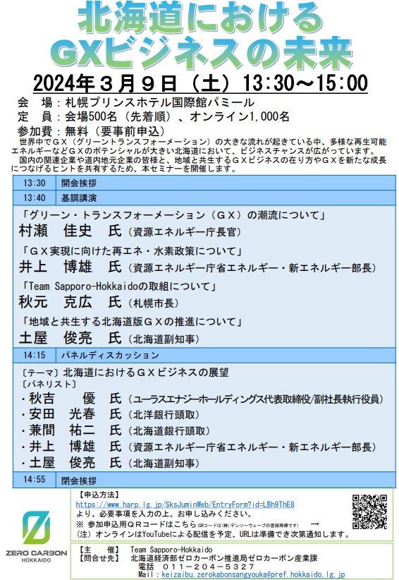 国内の関連企業や道内地元企業の皆様と、地域と共生するGXビジネスの在り方やGXを新たな成長につなげるヒントを共有するため、本セミナーを開催します。