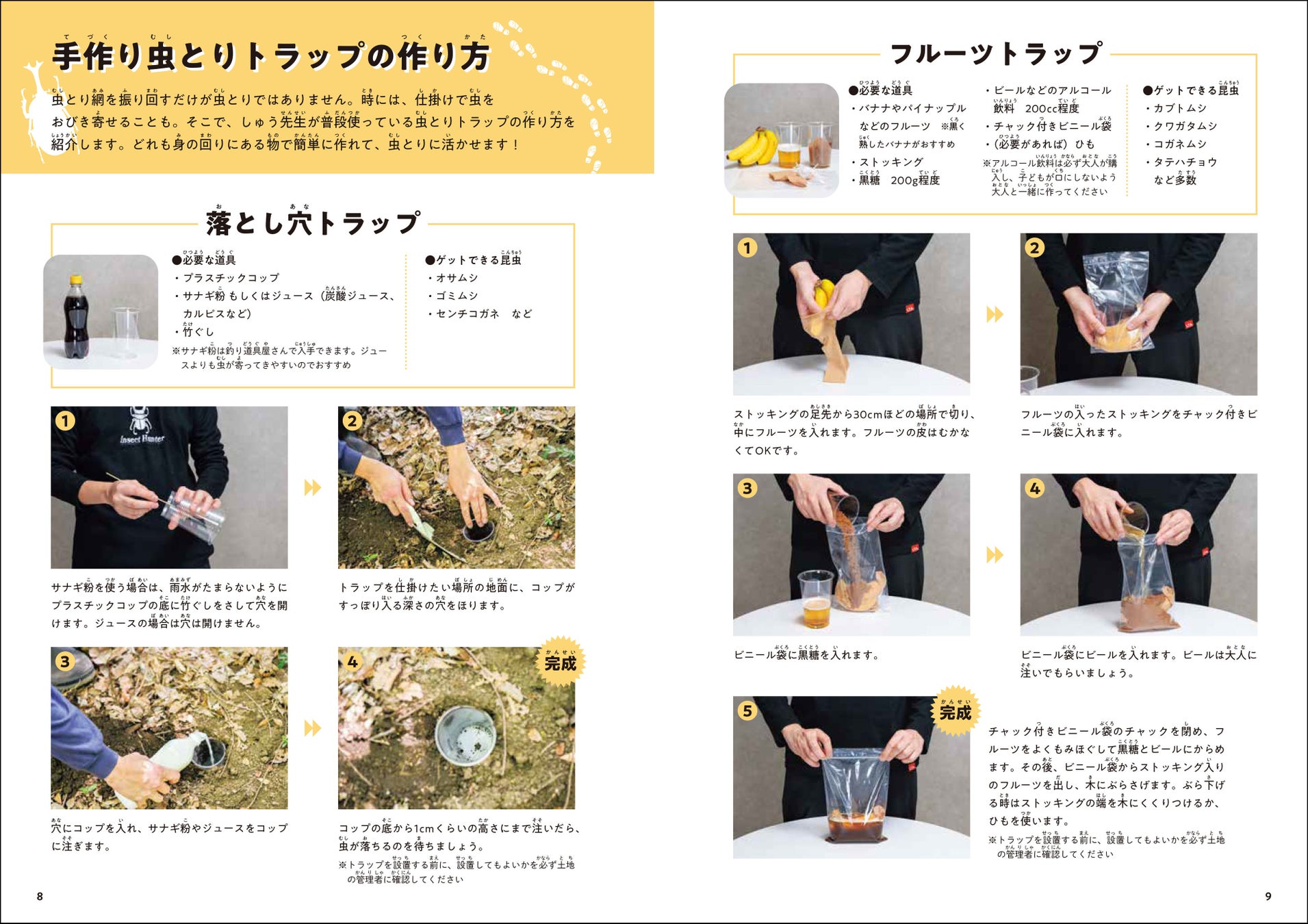 安全に楽しく虫とりをするための服装や持ち物をはじめ、親子で作れる4種類の「虫とりトラップ」の作り方といった実践的な内容も掲載。 虫とりトラップの材料はほとんどをスーパーマーケットや100円ショップでそろえられるので、子どもの自由研究などにも活用できる手軽さとなっています。