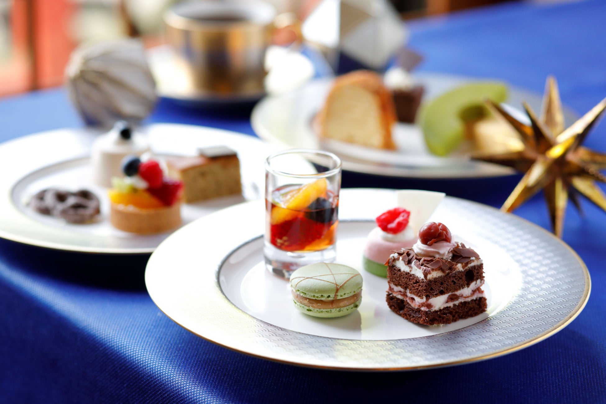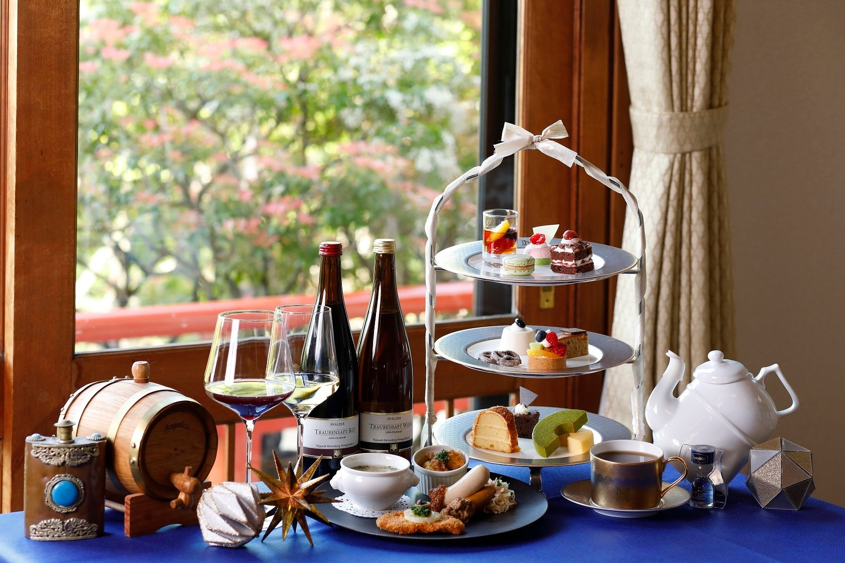 3段のティースタンドには、ロンネフェルト茶葉を使用した「ダージリン紅茶のゼリー」と「アールグレイ紅茶のケーキ」や、奈良月ヶ瀬ティーファーム井ノ倉の茶葉を使用した「抹茶と苺のムース」、「ほうじ茶パンナコッタ」など、日本とドイツの和洋折衷を表現した、奈良ホテルらしいテーマでスイーツをご提供いたします。そのほか「シュバルツバルダーキルシュトルテ」や「バウムクーヘン」など、ドイツの代表銘菓もお楽しみいただけます。