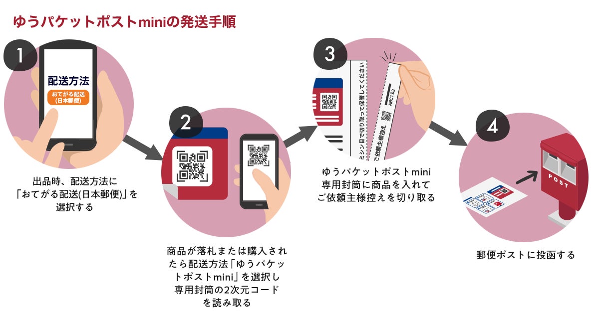 ユーザーは専用の資材「ゆうパケットポストmini封筒」を郵便局で購入し、2次元コードを「ヤフオク!」アプリ、「PayPayフリマ」アプリで読み取るだけで発送手続きできます。また、商品は購入者の自宅のポストに配達されるため、再配達の手配など受け取りに関する負荷が削減できます。