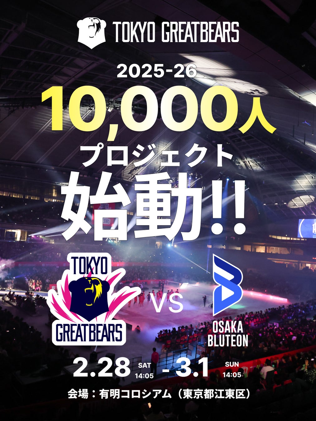 このたび、株式会社グレートベアーズ(本社:東京都渋谷区、代表取締役:久保田健司)は、2026年2月28日(土)、3月1日(日)の東京グレートベアーズ ホームゲーム 大阪ブルテオン戦を「10,000人プロジェクト」と銘打って開催することが決まりましたので、お知らせいたします。