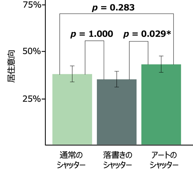 その結果、居住意向を示した割合は、通常: 38.2%、 落書き: 35.4%、アート: 43.4%となり、落書きとアートで有意差が検出されました。通常と比較しても、アートの方が高いスコアを獲得しましたが、有意差は検出されませんでした。しかし、これはアートの種類や完成度によって、さらなる高い効果を得られると期待されます。
