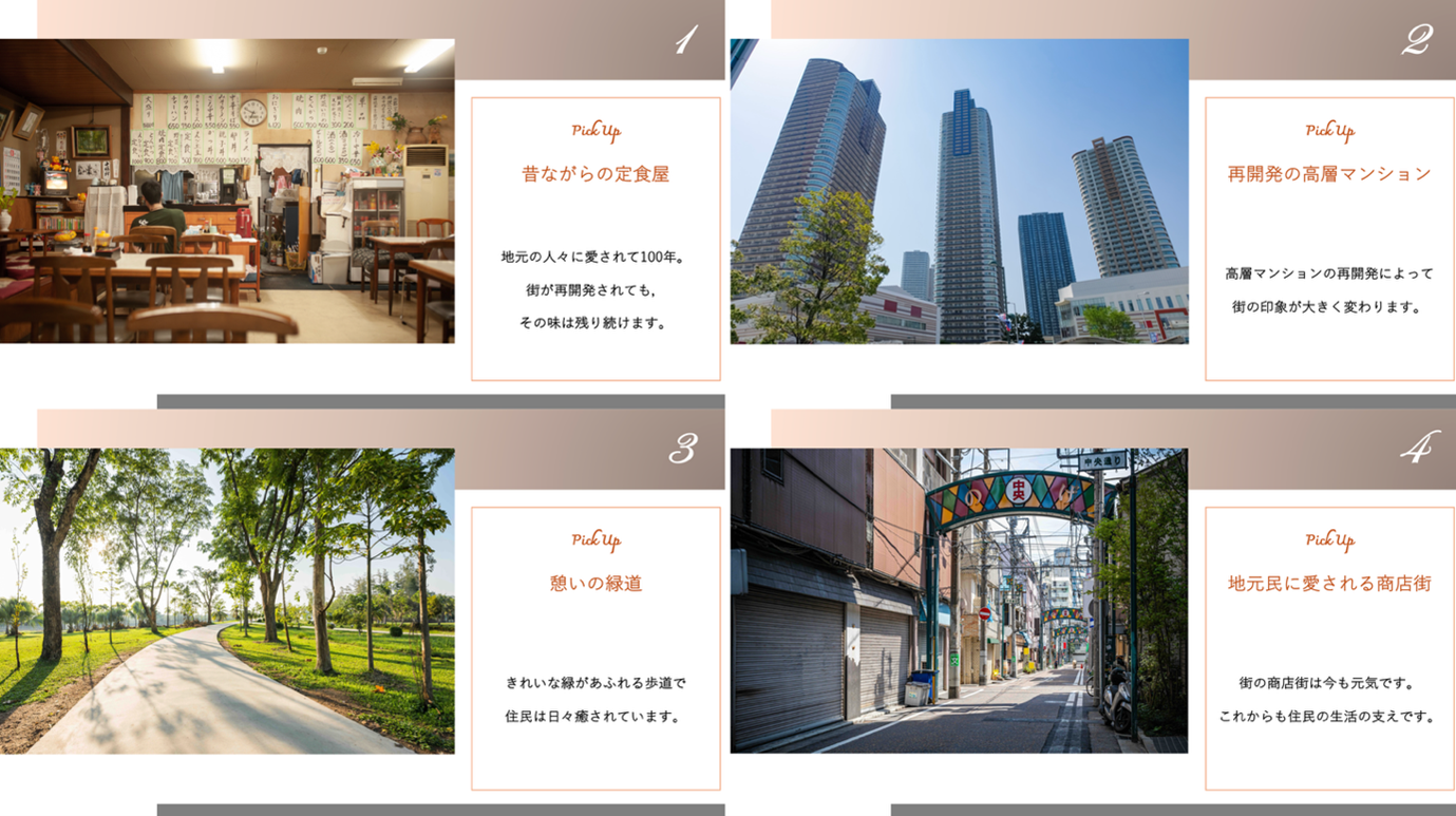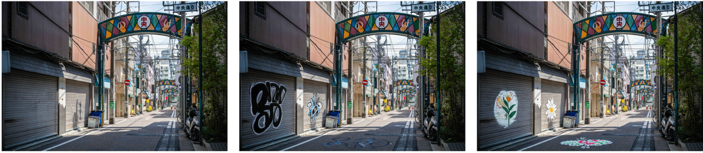 そこで、本研究は、日本の20-60代の人々1,500人を対象にしたオンライン調査環境でのランダム化比較試験によって、シャッターアートの効果を検証しました。被験者を無作為に、グループ1:通常、グループ2:落書き、グループ3:アートに分け、図1に示す都市の情報を提示しました。その中に、興味の対象である商店街のシャッターの写真が含まれており、図2に示すとおり、各グループに対応する写真を挿入しました。つまり、被験者は、シャッターの評価とは認識することがないため、バイアスを与えずに、シャッターの効果だけを抽出することができます。