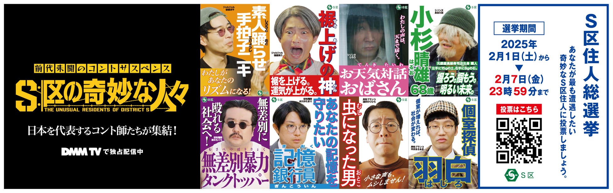 まさにここでしか見られない顔ぶれがそろった本作。最高のコント師たち8人と、実力派俳優3人が真剣に挑んだ新感覚のコントサスペンス、「S区の奇妙な人々」はDMM TVにて現在3話まで独占配信中!この機会に、珠玉のコント×サスペンスドラマの融合でお届けする全く新しい映像体験をご堪能ください!!