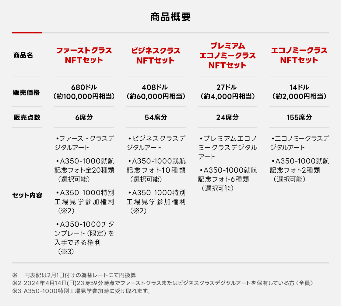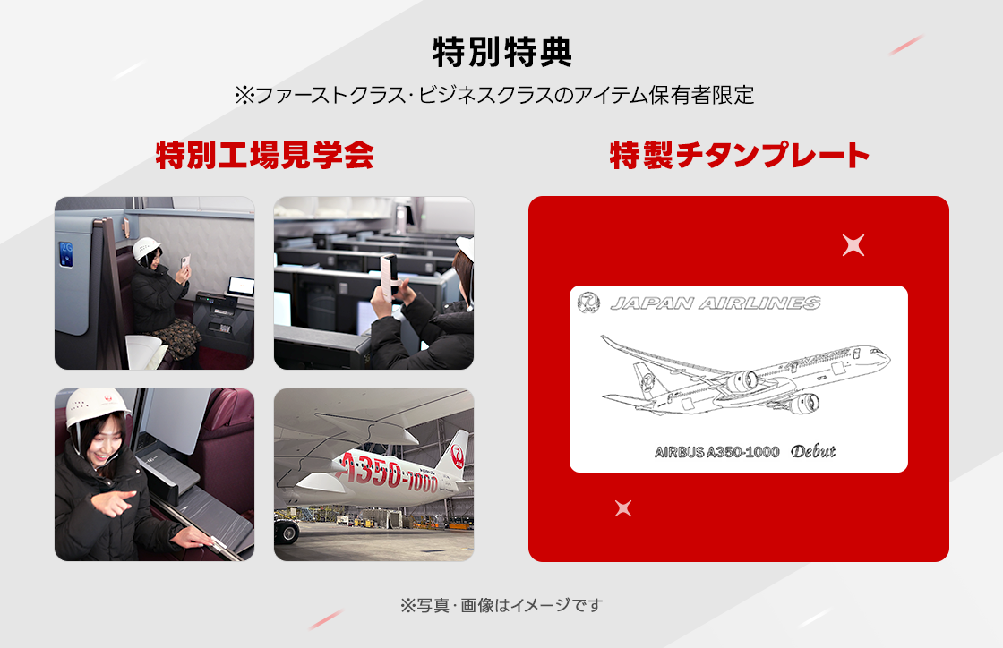 さらに、ファーストクラス・ビジネスクラスのデジタルアート保有者には、特典として、「A350-1000」の機内に入ることができる工場見学会に招待します。JALの整備士が直接案内し、「A350-1000」について魅力を語るなど特別な体験を提供予定です。またファーストクラスデジタルアート保有者には、当日の工場見学会で記念品として楽しめるA350-1000チタンプレートをプレゼントします。