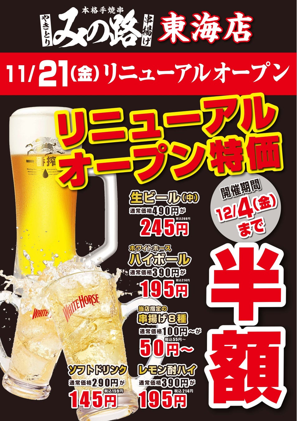 「美濃路 東海店」が “みの路 東海店” として本日リニューアルオープン!12月4日まで、最大半額のオープニングフェアを開催!