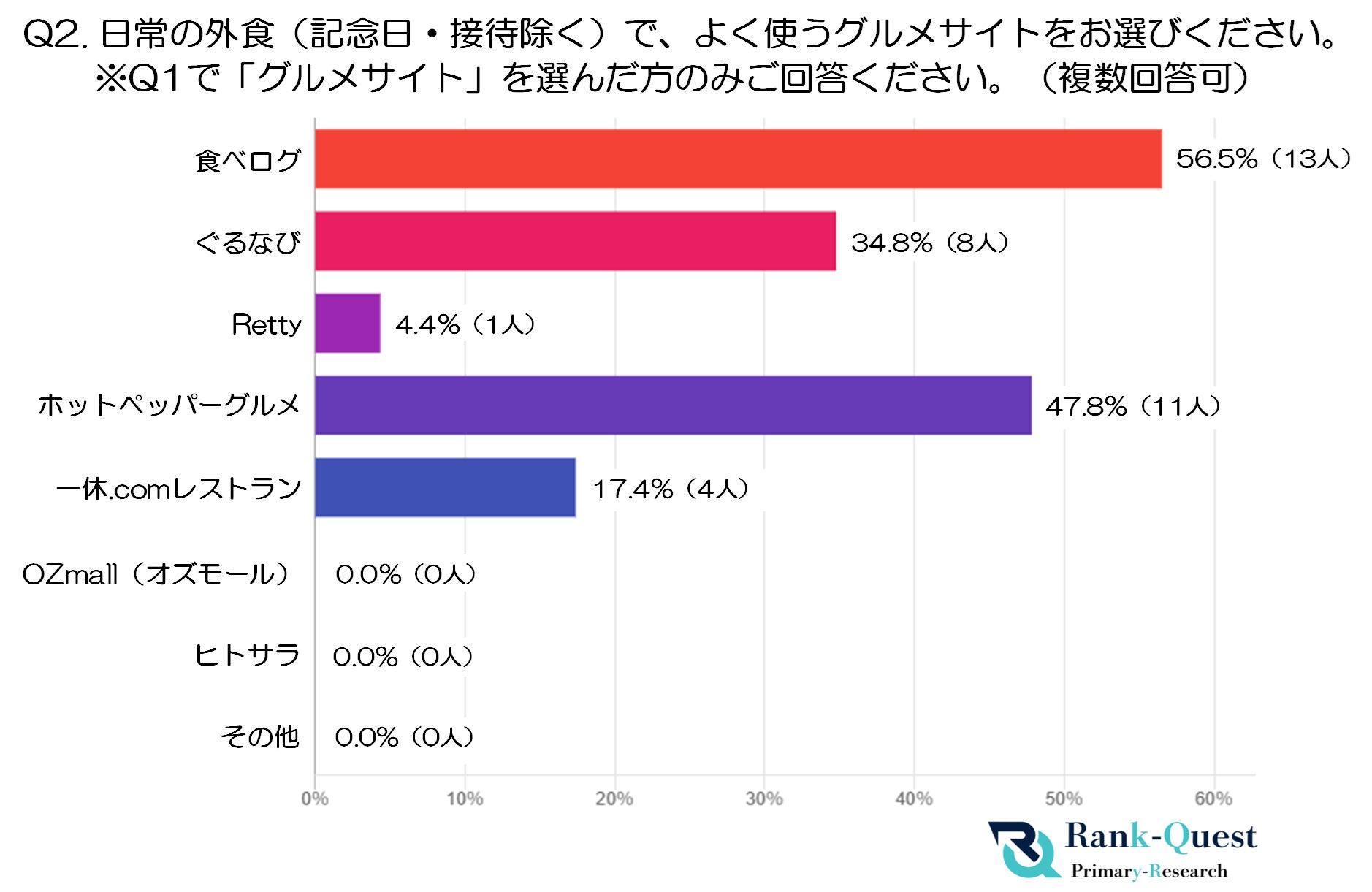 一方で、「一休.comレストラン」(17.4%・4人)は利用が限定的で、比較的特別な場面や層に偏っている可能性があります。