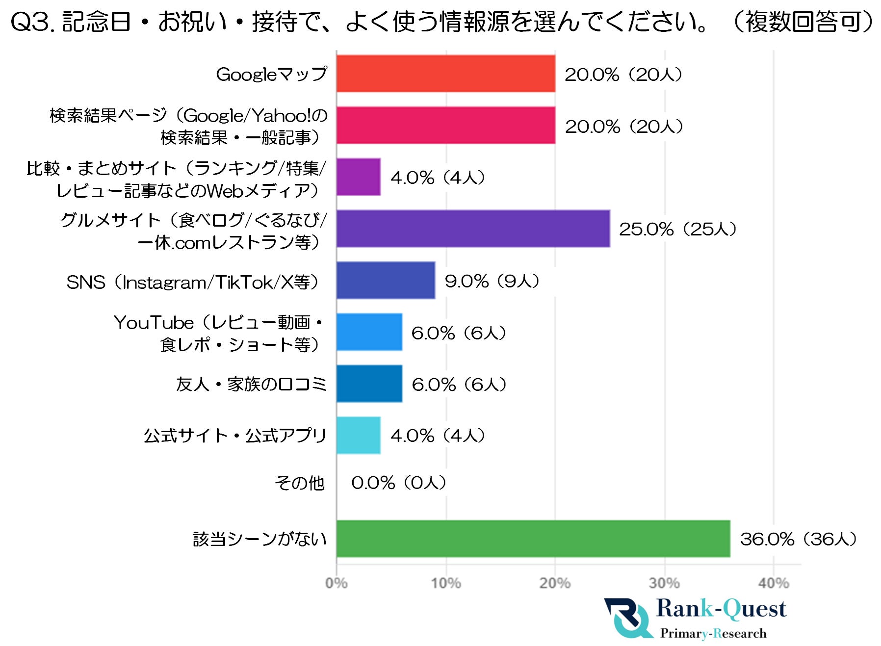 最も多かったのは 「グルメサイト」(25.0%・25人) で、特別な外食シーンにおいては特に口コミや詳細情報が重視されていることが分かります。