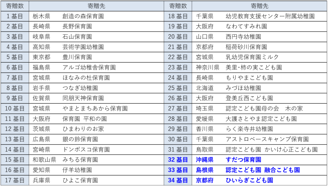 寄贈先は27都道府県34園になります。青字は今回寄贈が決定した園です。