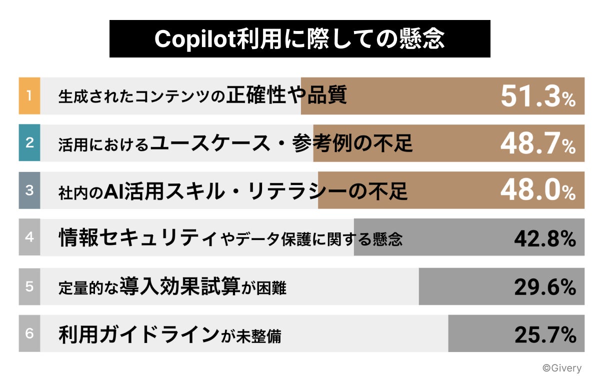 企業におけるCopilot活用への期待や関心は高い反面、企業内のナレッジ不足も深刻な課題であり、Copilotの導入・利活用による業務効率化を進めるには、それらの課題に対するサポートも必要であることが窺えます。