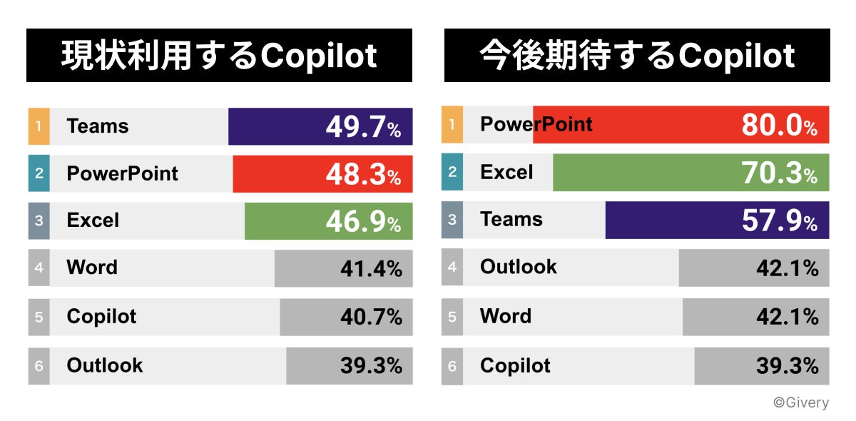 ・現状のCopilot利用状況ではTeamsが約5割で最も利用が多く、次いでPowerPoint、Excel、Word、Copilot自体がそれぞれ4割を超えている。中でも最も期待が高いのはPowerPoint。