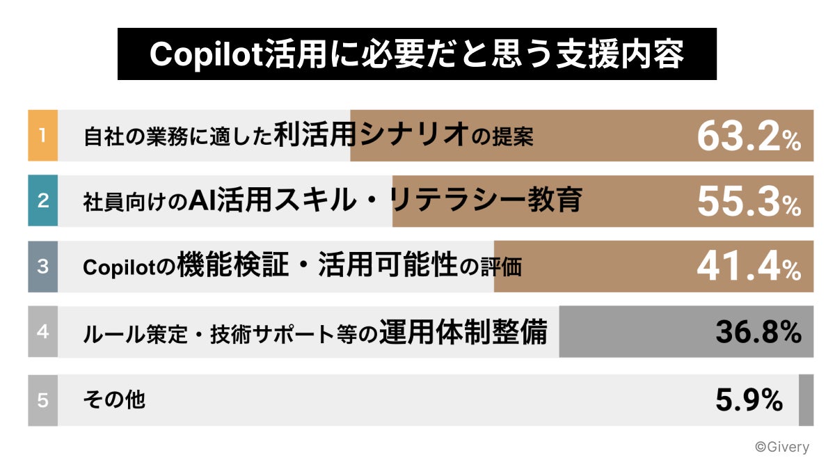 ・Copilot活用促進のための支援内容として、6割を超える企業が「実際の業務現場での具体的な活用シナリオ」を求める。また半数以上の企業が「AIスキル・リテラシー向上のための社内教育・トレーニング」を要望している。
