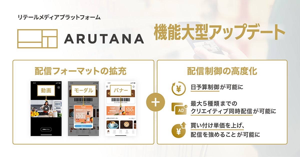 これまで多くのリテールアプリが単一クリエイティブと期間固定純広告形式での販売に限定されていました。今回のアップデートによりARUTANAでは、動画形式での広告配信や1リテールにつき「動画」「モーダル」「バナー」の3フォーマットでの配信が可能になるなど配信フォーマットが拡充されます。日予算制御も可能になるため、リテールアプリにおける運用型の配信が実現します。これにより広告主は予算や配信内容を柔軟に運用できターゲットに最適な情報を届けることができます。