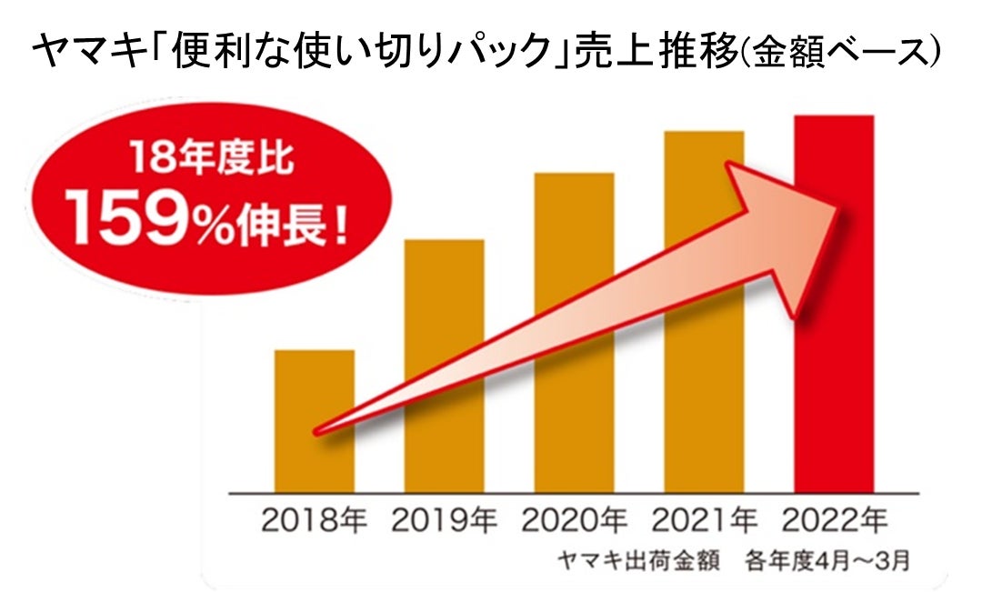 単身者世帯や小分け商品需要の増加により、ヤマキの使い切りかつおパックの売り上げは2018年からの5年で約160%伸長しています(※)。