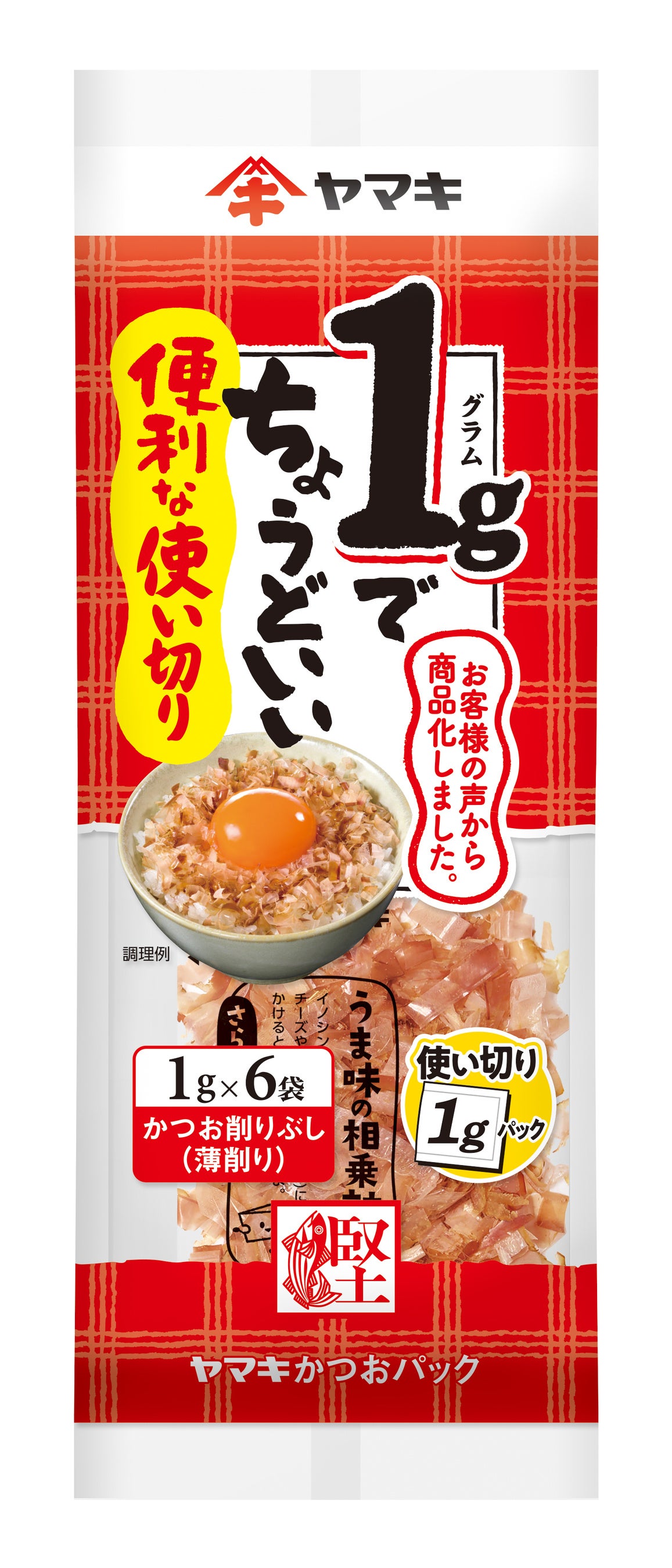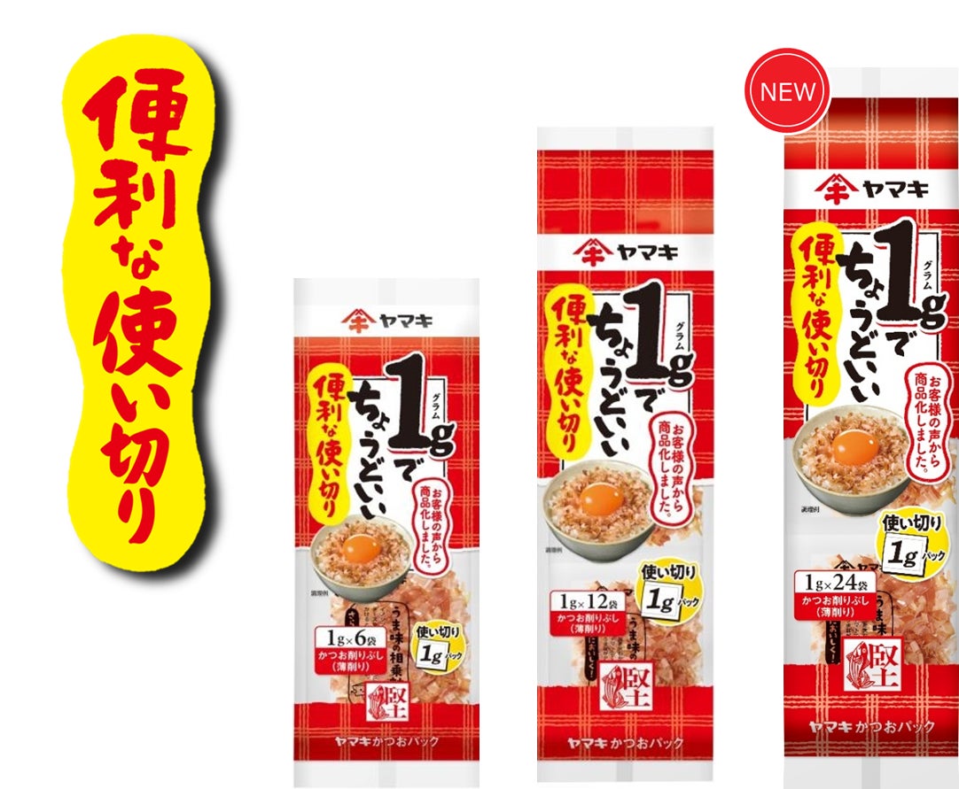 ヤマキは、1袋で使いきれるかつおパック商品が欲しいというお客様の声に応えるため、2015年に「使い切りかつおパックマイルド1g×12袋」を発売しました。そして2021年、新デザインとなる『便利な使い切り』シリーズにパッケージをリニューアルし、さらに「便利な使い切りパック 1g×6袋」を発売。お客様のニーズに対応し、商品のバリエーションを増やしてきました。その結果、「余らせずに使いきれる」ことや「ふんわりとした口当たりの良い食感を常に楽しめる」ことなどで好評をいただいています。