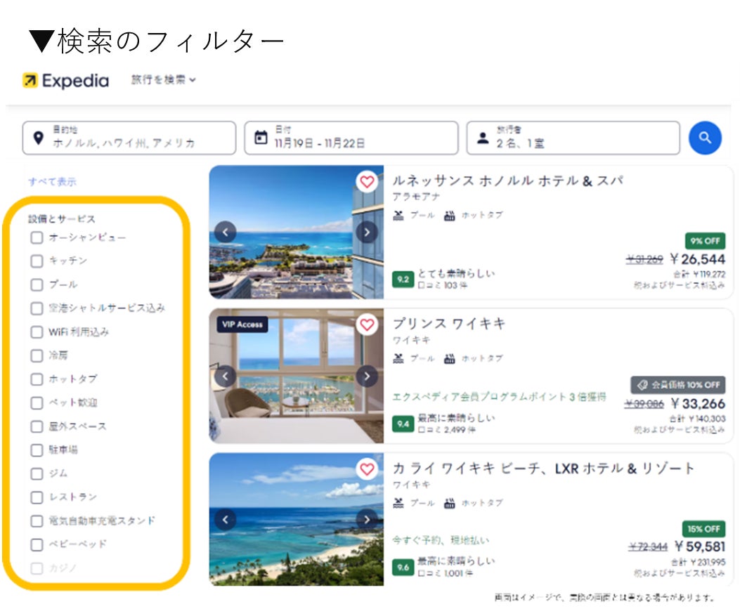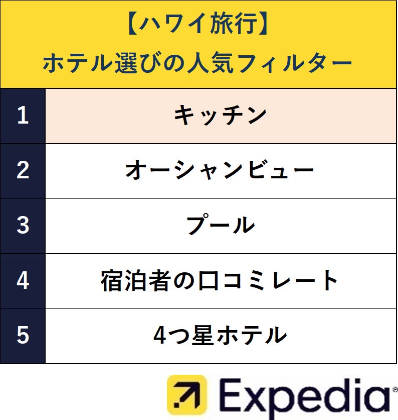 エクスペディアでは、「プール」「ジム」「駐車場」など、希望する設備やサービスの有無をフィルター機能で調べた上でホテルを選ぶことができます。ハワイのホテルを検索しているユーザーが最も多く使っていたフィルター※1は「キッチン」であり、昨今の観光地の物価高や為替の影響からか、レストランではなくホテルの部屋で料理をして食事をしようと考える人が多いことが分かります。その他は、「オーシャンビュー」や「プール」など、ハワイ旅行には欠かせない条件や設備の有無を調べている人が多くみられました。