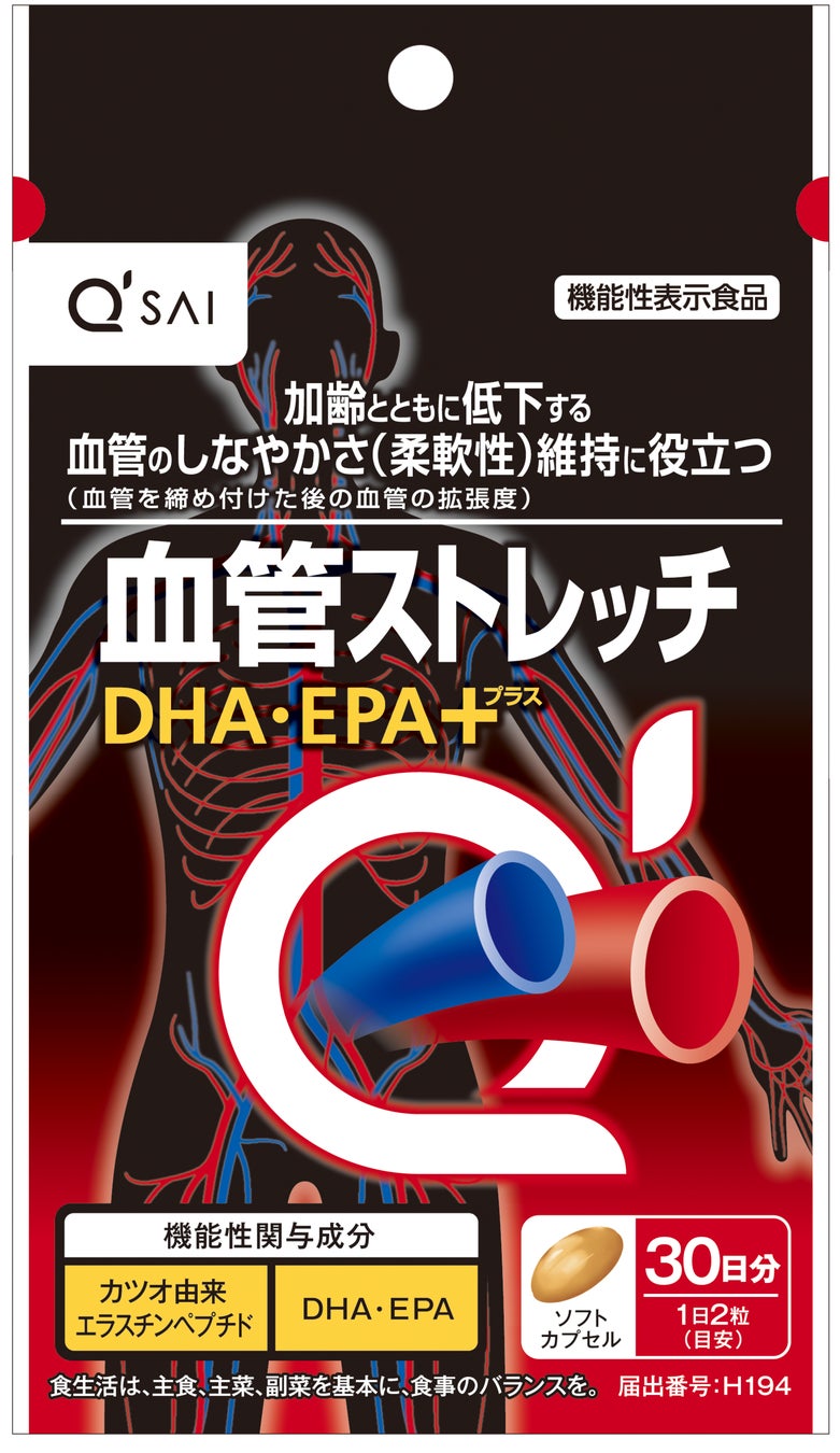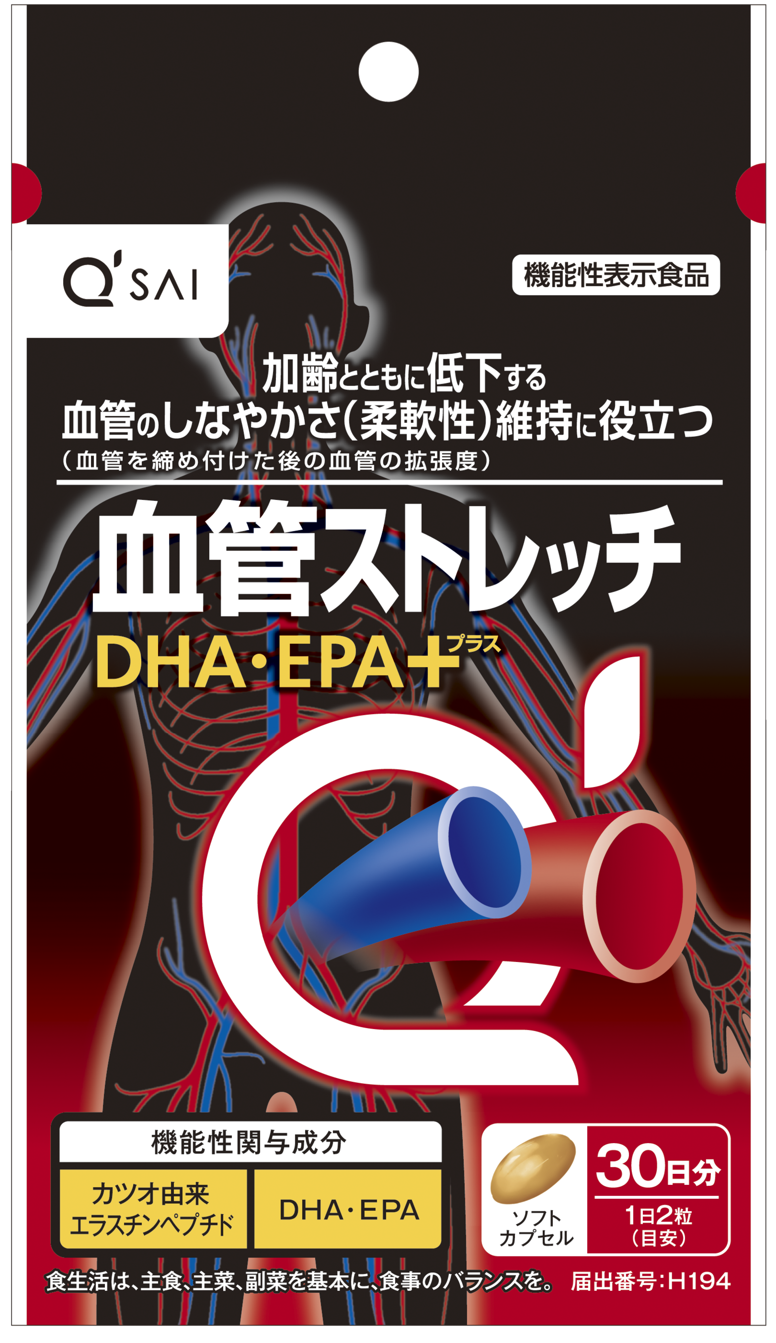 【届出表示】 本品には、カツオ由来エラスチンペプチド、DHA・EPAが含まれています。カツオ由来エラスチンペプチドには、加齢とともに低下する血管のしなやかさ(柔軟性)(血管を締め付けた後の血管の拡張度)維持に役立つ機能があることが報告されています。DHA・EPAには、血液中の中性脂肪を低下させる機能があることが報告されています。