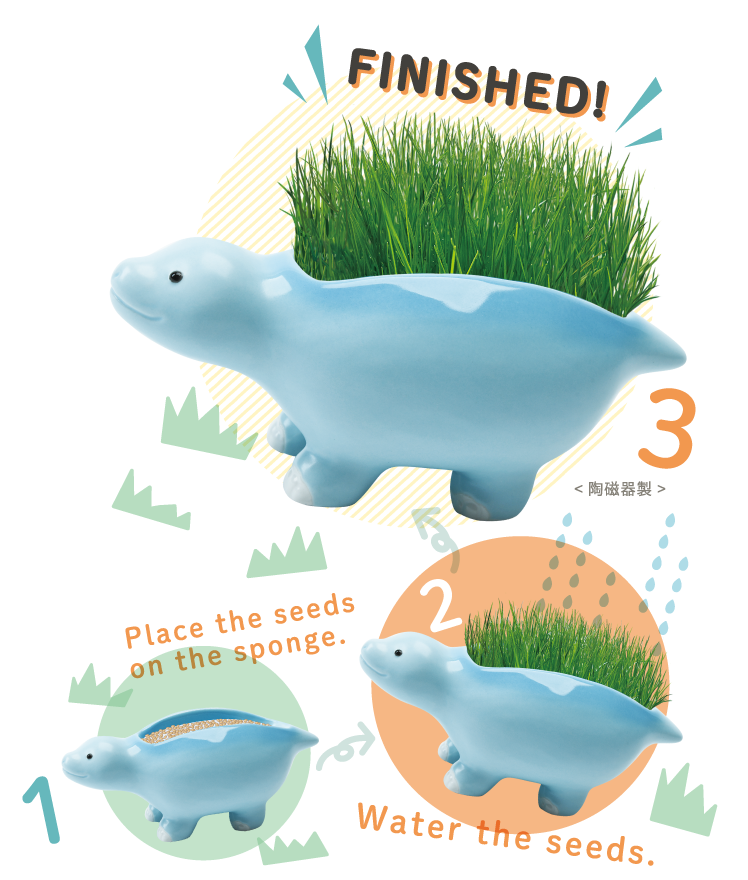 愛くるしい表情の恐竜の背中で、植物の成長を観察、お部屋のインテリアとして飾っておくことも可能です。