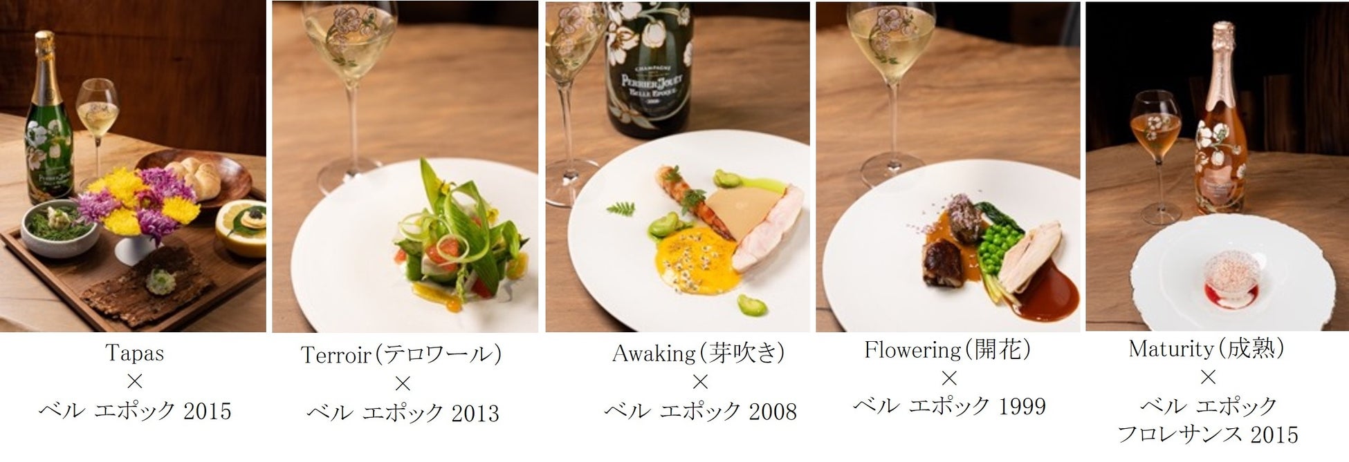 最高醸造責任者セヴリーヌ・フレルソンがシャンパーニュにまつわる自然のサイクルからインスピレーションを受け考案した、“Terroir(テロワール)”、“Awaking(芽吹き)”、 “Flowering(開花)”、 “Maturity(成熟)”の4つのキーエレメントをもとにペアリングディナーの構成を構築。このエレメントに沿って宮本シェフにより創り出されたお料理に合わせ、セヴリーヌが「ペリエ ジュエ ベル エポック」のヴィンテージ各種を選びました。最後の一皿、“Maturity (成熟)”のペアリングでは、苺とマスカルポーネを使ったデザートに、日本限定のロゼ・シャンパーニュである「ベル エポック フロレサンス 2015」を合わせ、シャンパーニュ地方の収穫の秋色を表現。