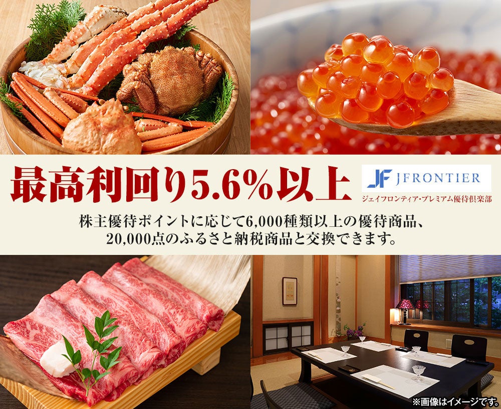 ジェイフロンティア株式会社(本社:東京都渋谷区、代表者:代表取締役社長執行役員 中村篤弘、以下「当社」)は、株主の皆様への還元の強化と当社の投資対象としての魅力を高めることを目的に、最高利回り5.6%以上(※)、6,000種類以上の商品ラインナップから選べ、さらに20,000点のふるさと納税商品も選択可能な「ジェイフロンティア・プレミアム優待倶楽部」を新設いたしました。