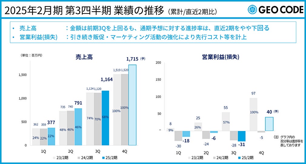 Webマーケティングとクラウドセールステックを展開する株式会社ジオコード(本社:東京都新宿区、代表取締役:原口大輔、証券コード:7357)は、1月14日に2025年2月期第3四半期の決算を発表しました。