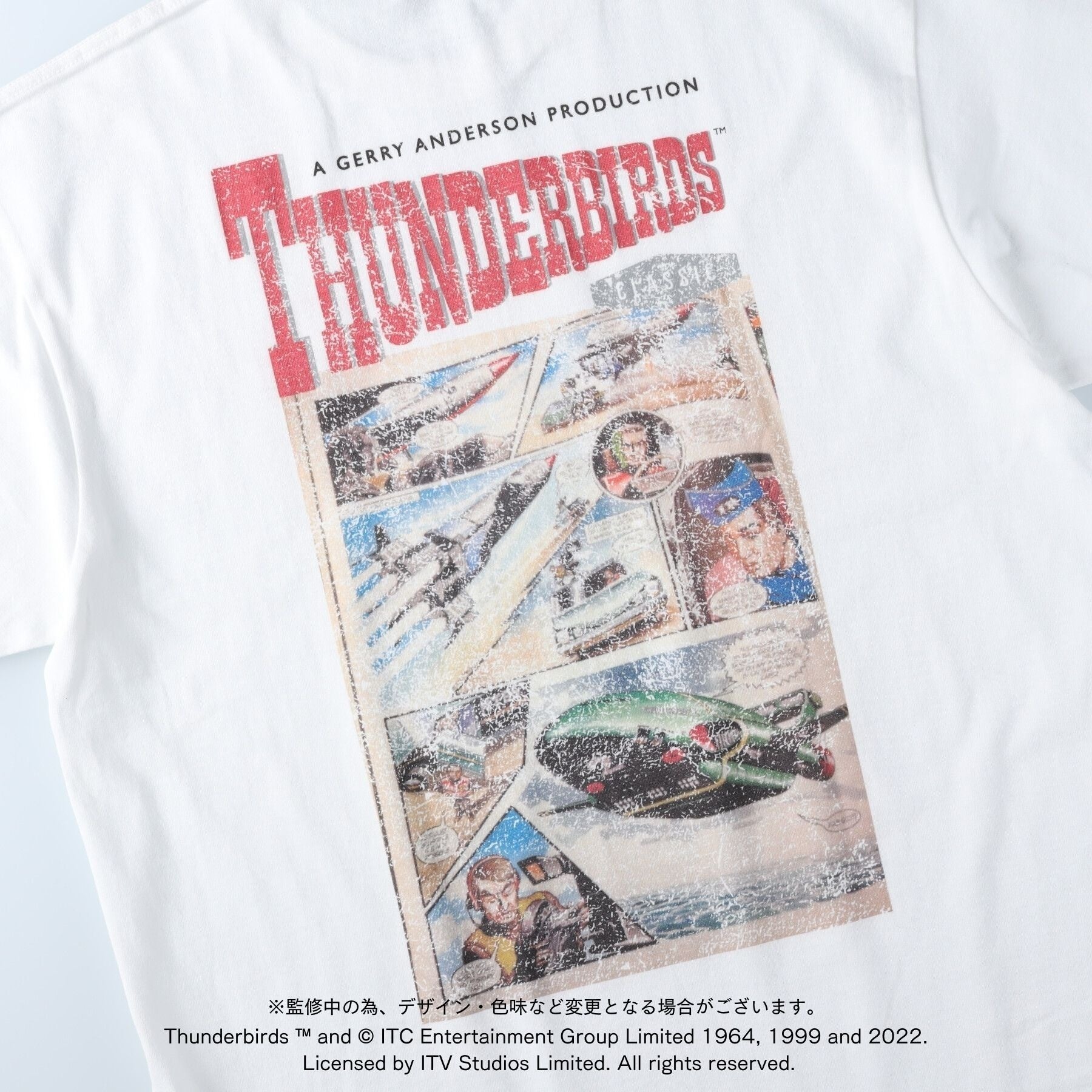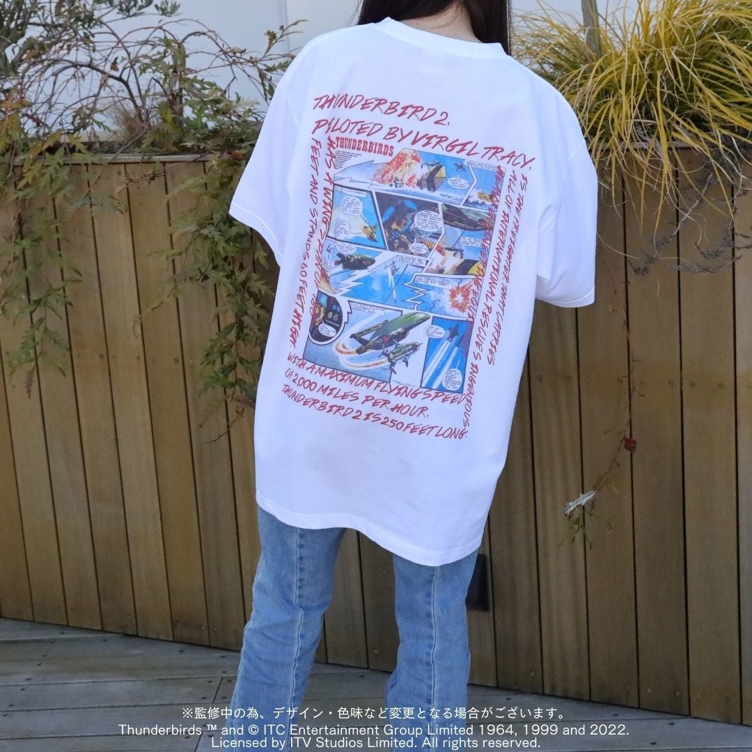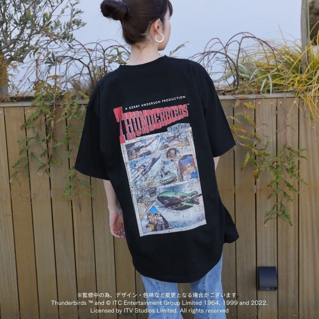背面に『サンダーバード』のロゴと、コミックの1ページをプリントした半袖Tシャツ。かすれたようなプリントで、世界観を表しています。胸元には、今回の主役であるレディ・ペネロープがプリントされています。