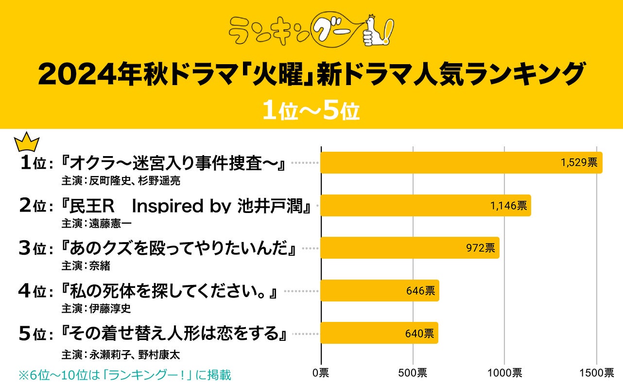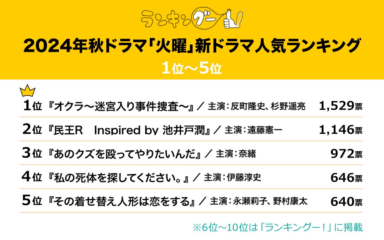 ランキングー!では2024年10月期の火曜放送の新ドラマを調査。全年代の男女(性別回答しないを含む)7,666名にアンケートを行い、TOP10を決定しました。ここではTOP5をご紹介します。