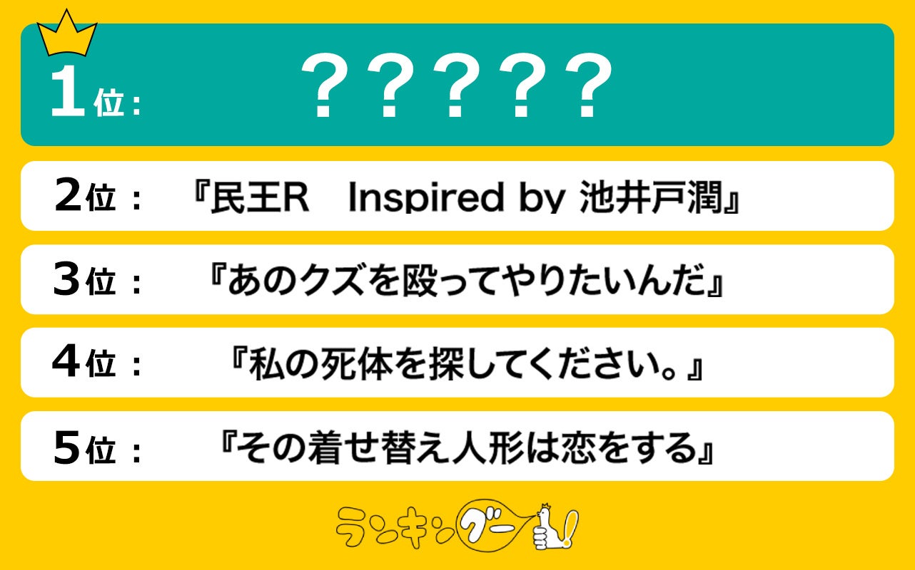 2位の『民王R Inspired by 池井戸潤』は、前作の人気もあり1,146票を集めランクイン。3位には『あのクズを殴ってやりたいんだ』が続き、4位には興味を引くタイトルで注目を集めた『私の死体を探してください。』。6票差で5位に選ばれたのは『その着せ替え人形は恋をする』でした。