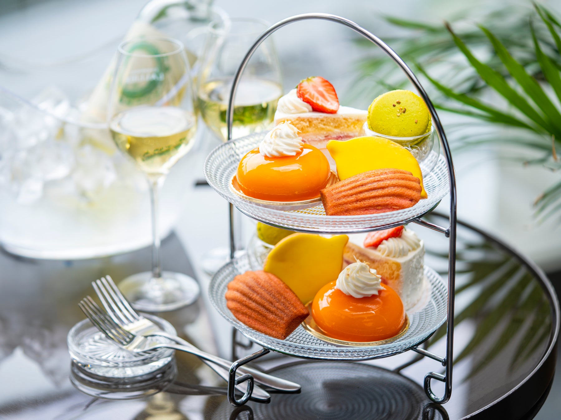 今年の夏は、夏のフルーツの王様マンゴーとココナッツのムースがぎっしりと詰まった、目を引くオレンジカラーの「エキゾチックケーキ」が主役の、夏らしく南国気分を味わえるアフタヌーンティーが登場。他にも濃厚なバターと夏を感じる爽やかなレモンの風味が相性抜群のサブレ、ピスタチオの味がぎゅっと詰まったマカロン、フランボワーズの風味が広がるしっとり上品なマドレーヌ、提供期間によって変わるショートケーキ(苺またはピーチ)の全5種類のスイーツをご用意しました。本格的なフランス菓子をホテルセレクトの紅茶と一緒にお楽しみください。