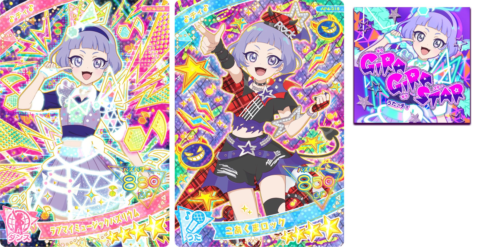 アニメにもたびたび登場し人気のキャラクター「チィ」が、ファンからのリクエストの声に応えてついに『ひみつのアイプリ』「4だん」に登場します。 「バズリウムコーデ」を着た★4カードなどがラインアップされており、「チィ」の楽曲「GIRA GIRA STAR」で遊ぶことができるカードも用意しています。