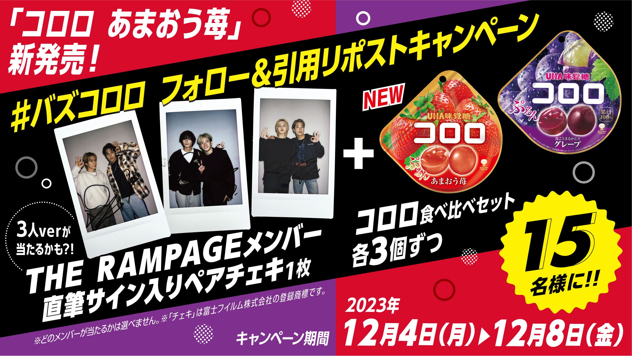 UHA味覚糖公式X(@UMikakuto)で実施されるフォロー&引用リポストキャンペーンに参加頂いた方の中から合計15名様にTHE RAMPAGEメンバーの直筆サイン入りペアチェキとコロロ食べ比べセットが当たるキャンペーンを実施します。