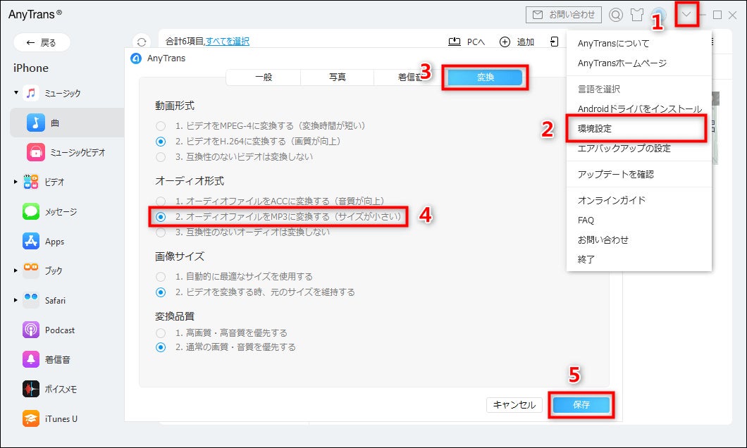 Step3.画面右上の設定マークをクリックして、「環境設定」を選択し、続けて「変換」をクリックし、オーディオ形式で「オーディオファイルをMP3に変換する」にチェックを入れ、最後に「保存」をクリックします。