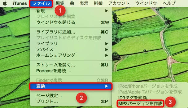 Step 4:「変換」メニューの中から、「MP3バージョンを作成」をクリックします。これにより、選択した音楽がM4AからMP3形式に変換されます。
