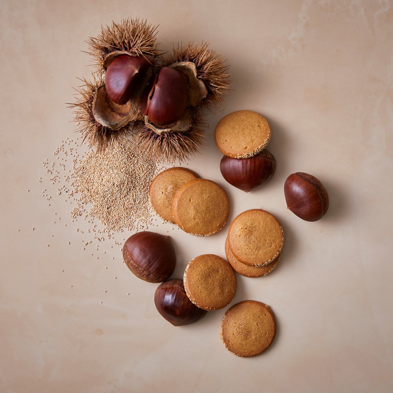 けしの実をあしらい栗をイメージした、芳ばしい栗の香り広がるサクサク食感のクッキー。「優しい甘さ」「皮の渋さ」を感じる2種類のマロンペーストを使用することで、味に重厚感をもたせました。
