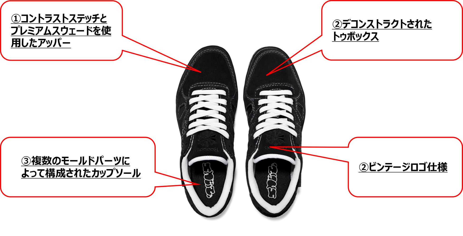 当モデルは、80年代のリーボックのコートシューズを細部にわたり模しており、当時のビンテージ感を忠実に再現しています。その特徴は下記の通りです。