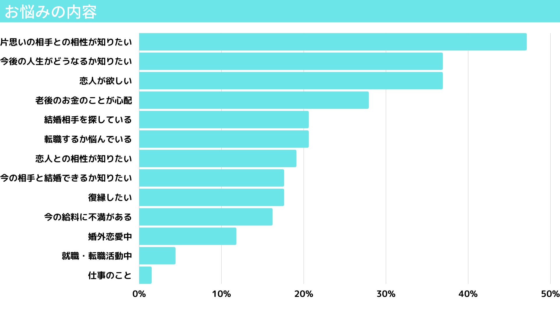 - 悩みの第1位は「片思いの相手との相性が知りたい」で47.7%