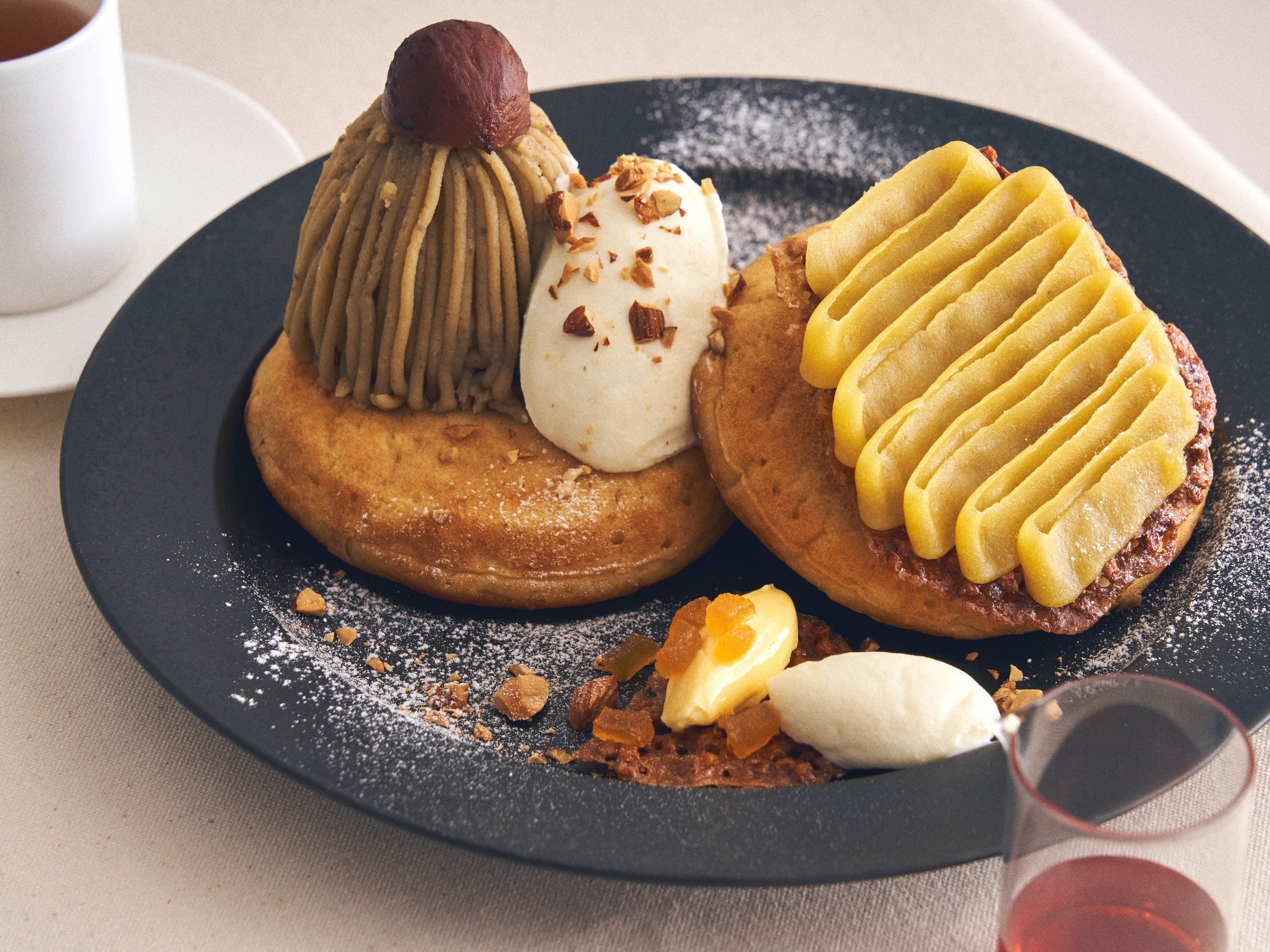 ひとつで2度おいしい!「和栗モンブラン」と「安納芋モンブラン」、2つの味を楽しめる贅沢なパンケーキ。