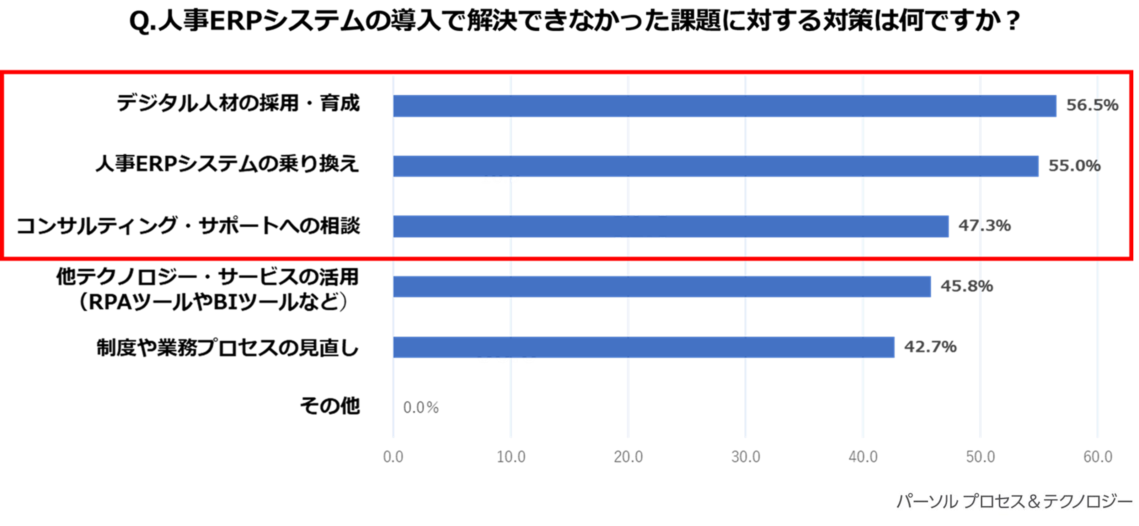 人事ERPシステムを導入しても解決できなかった課題を解決するための検討事項として「デジタル人材の採用・育成(56.5%)」が最も多く、続いて「人事ERPシステムの乗り換え(55.0%)」「コンサルティング・サポートへの相談(47.3%)」と回答した人が多く見受けられました。