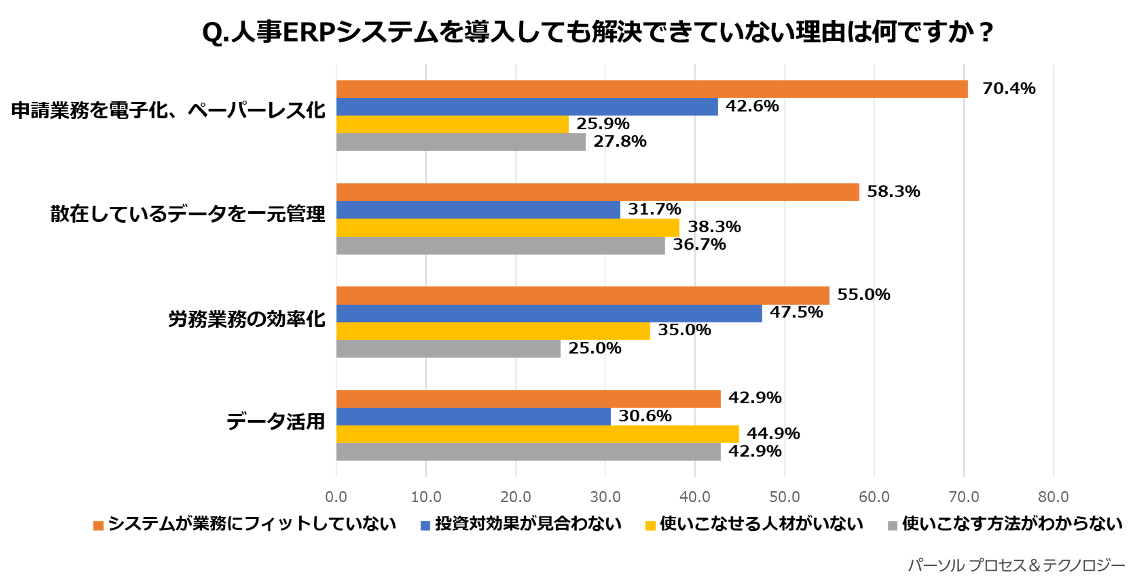人事ERPシステムを導入しても解決できていない理由として、「申請業務の電子化/ペーパーレス化」「散在しているデータの一元管理」「労務業務の効率化」の課題については「システムが業務にフィットしていない」が一番多い結果となりました。