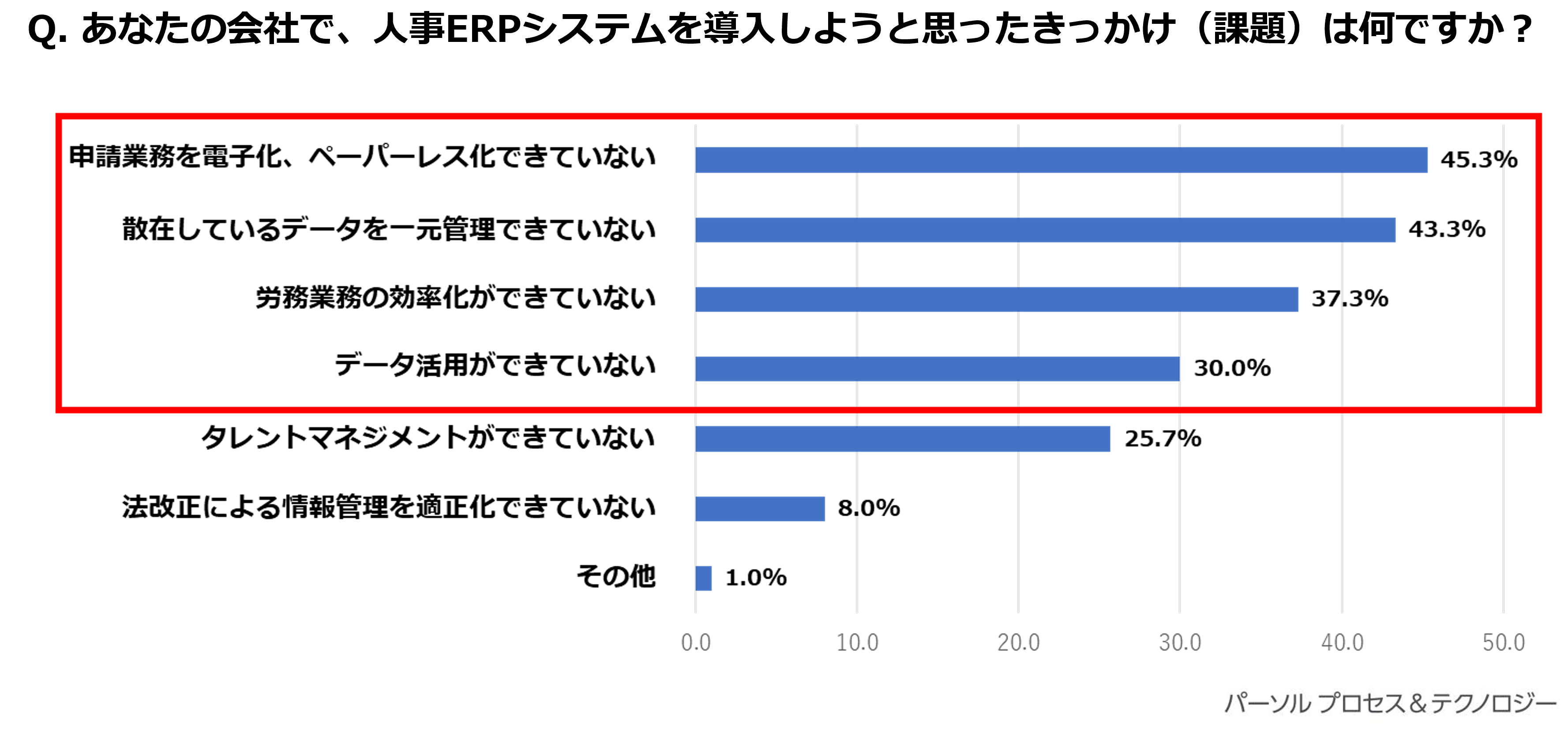 人事ERPシステム導入時の課題やきっかけとして「申請業務を電子化、ペーパーレス化できていない(45.3%)」が最も多く、続いて「散在しているデータを一元管理できていない(43.3%)」「労務業務の効率化ができていない(37.3%)」「データ活用ができていない(30.0%)」という結果となりました。